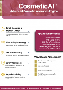 CosmeticAI™ extends Ainnocence’s proprietary in-silico engineering framework originally built for small molecules and formulation design into a dedicated peptide and small-molecule design engine coupled with a formulation-aware optimization layer. The platform enables large-scale virtual generation and optimization of candidate molecules directly from target sequences, allowing controlled exploration of molecule space prior to experimental validation.